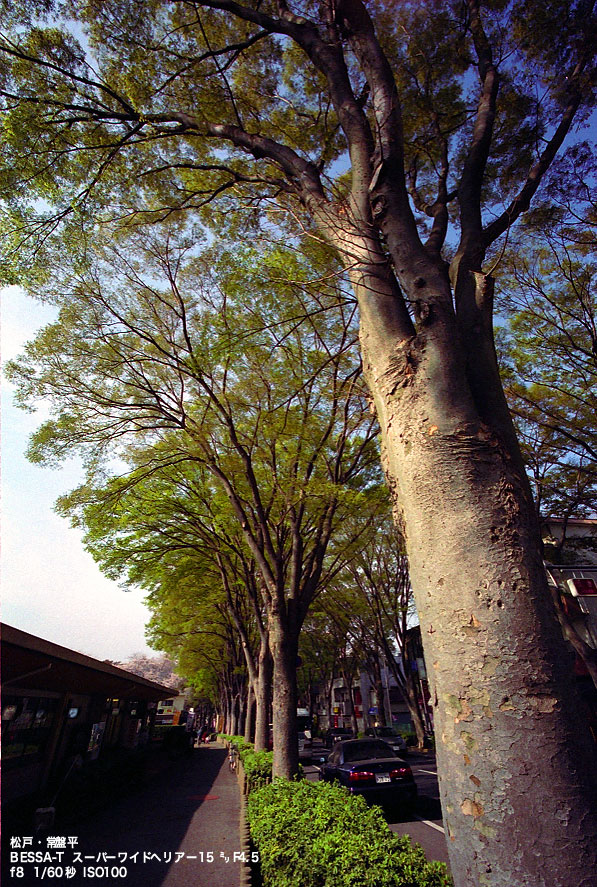 スーパーワイドヘリアー15/4.5常盤平駅へと続くけやき通り。新緑の季節は歩くのが楽しい。育ちすぎた街路樹はムクドリの恰好の住処。爆撃を気にしつつ歩くこともある。SWHの描写は植物には固すぎるかもしれない。